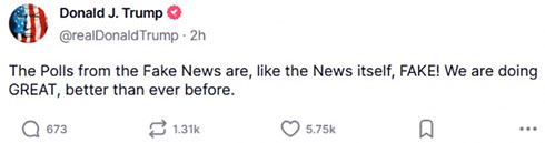 "Опитування брехливих ЗМІ, як і самі ці фейкові новини, є фейком! Ми чудово справляємося, краще, ніж будь-коли раніше", - написав Трамп.
