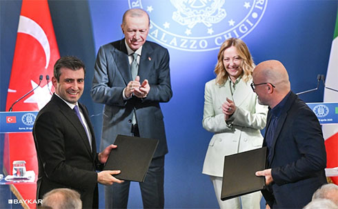 Голова правління та технічний директор компанії Baykar Сельчук Байрактар та головний виконавчий директор і генеральний директор Leonardo Роберто Чінголані передали один одному примірники меморандуму про взаєморозуміння, підписаного в Римі 6 березня 2025 року, який має на меті об'єднання високотехнологічних можливостей двох компаній.