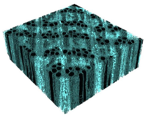 Зображення показує розподіл феригідриту у внутрішній структурі деревини (бірюзового кольору)/Florida Atlantic University