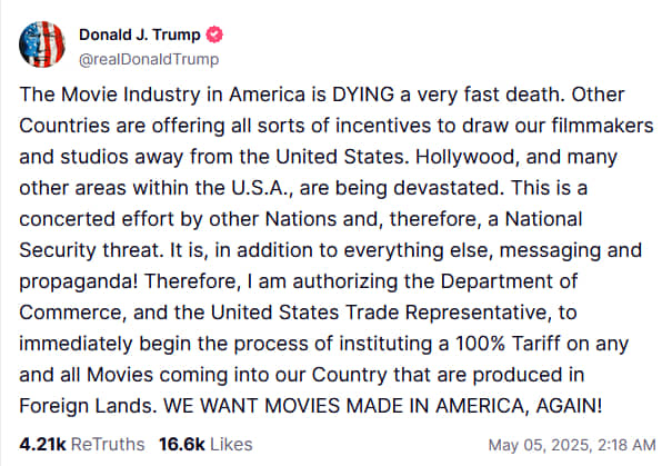"Кіноіндустрія в Америці помирає швидкою смертю. Інші країни пропонують різноманітні стимули аби забрати наших кіновиробників і студії зі Сполучених Штатів. Голівуд й багато інших місць у США спустошуються. Це узгоджені зусилля інших націй, а отже - загроза національній безпеці", - написав Трамп в Truth Social.