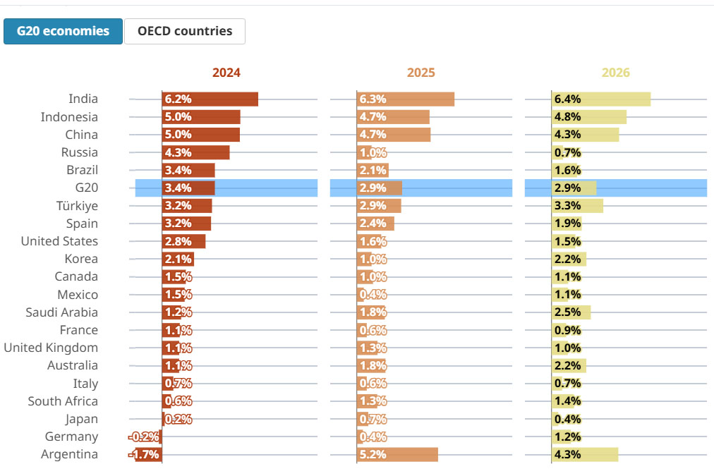 Наразі ОЕСР прогнозує, що зростання світової економіки сповільниться до 2,9% цьогоріч із 3,3% у 2024 році. Організація очікує, що темпи зростання в США знизяться ще більше, до 1,6% з 2,8%, що значно нижче прогнозу, зробленого в березні.