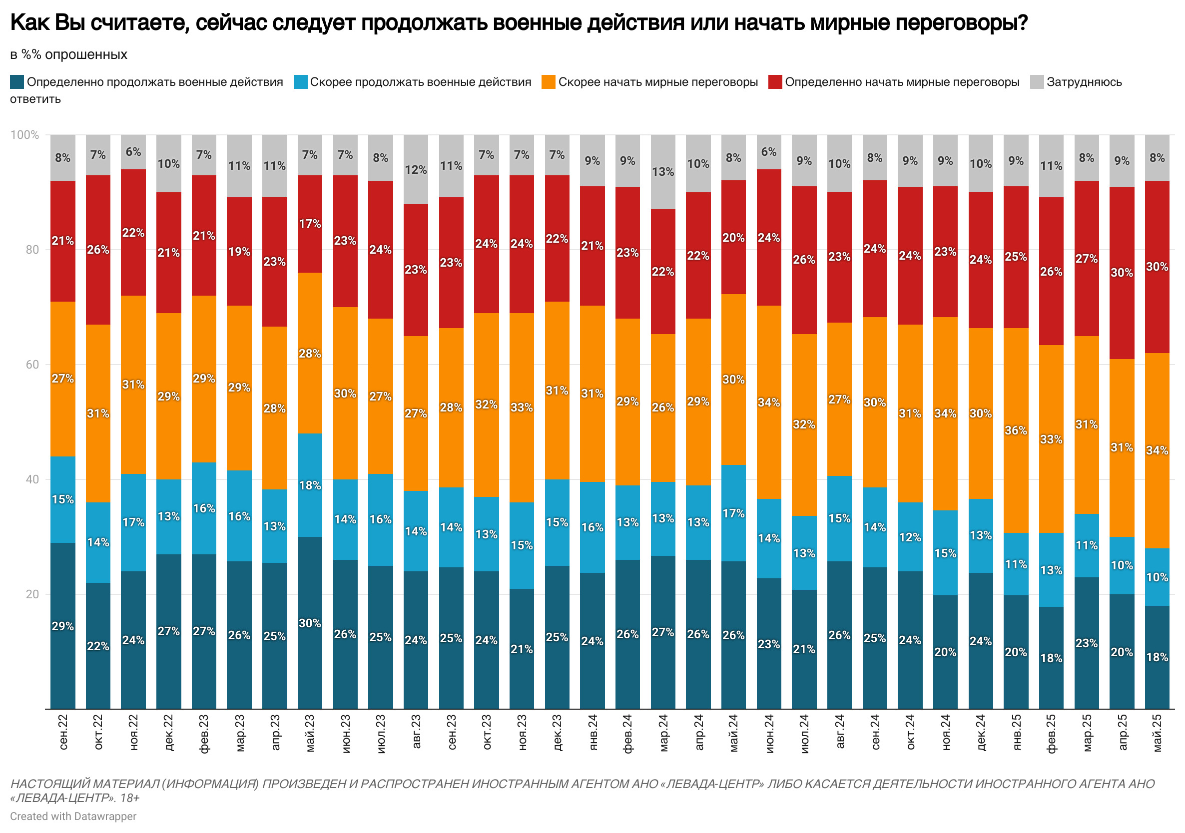Одночасно з цим кількість прихильників продовження війни скоротилася до мінімальної за весь час спостережень - 28%. Ще в березні таких було 34% серед опитаних росіян.