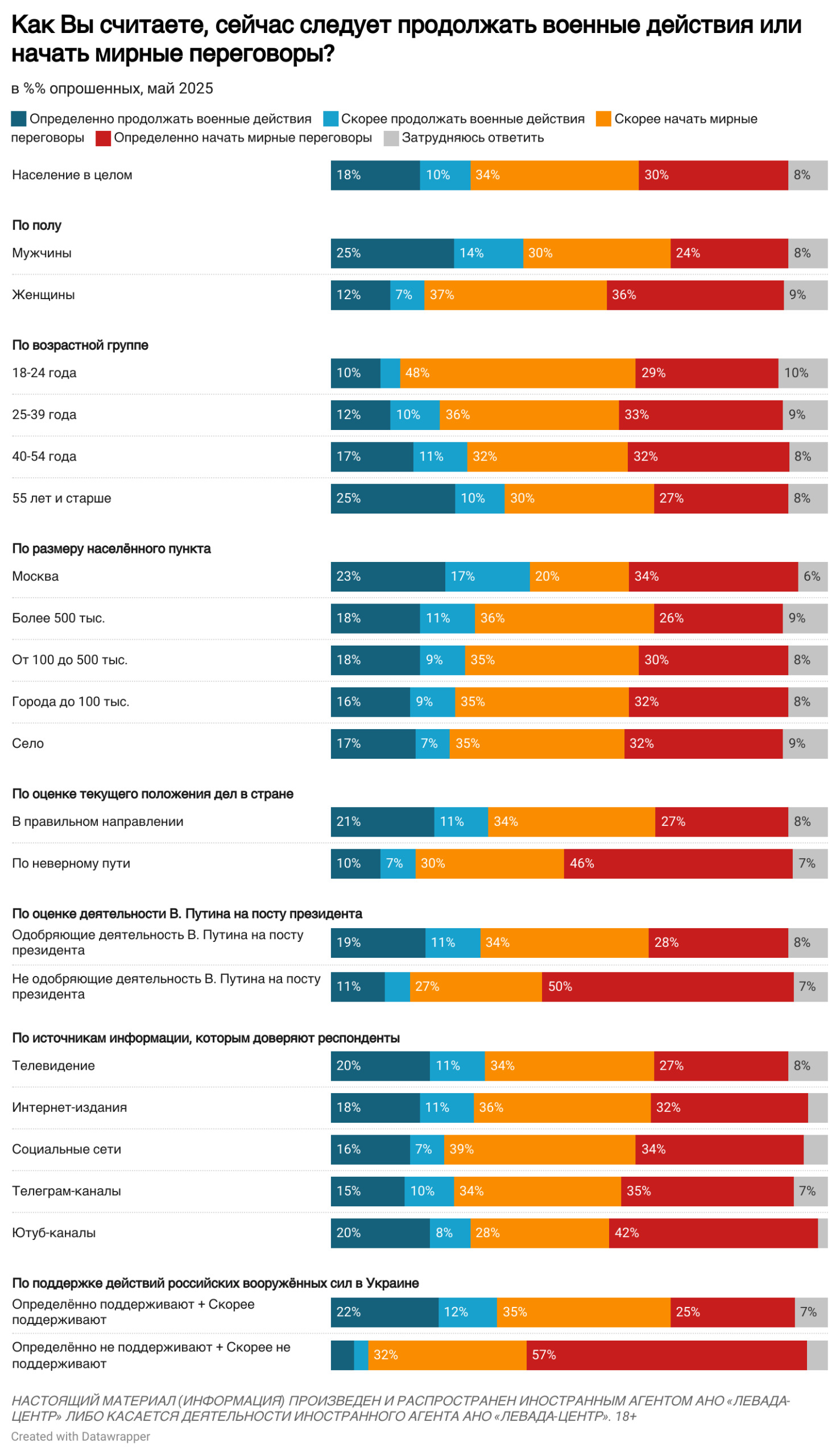 Ті, хто підтримують мирний діалог, частіше говорять про необхідність повернення полонених (24%) і бажання миру (24%). Ще 23% вважають, що необхідно швидше завершити конфлікт і закінчити війну (23%). Ті, хто не підтримує переговори, говорять про їхню марність у принципі (41%) і необхідність довести війну до кінця (15%).
