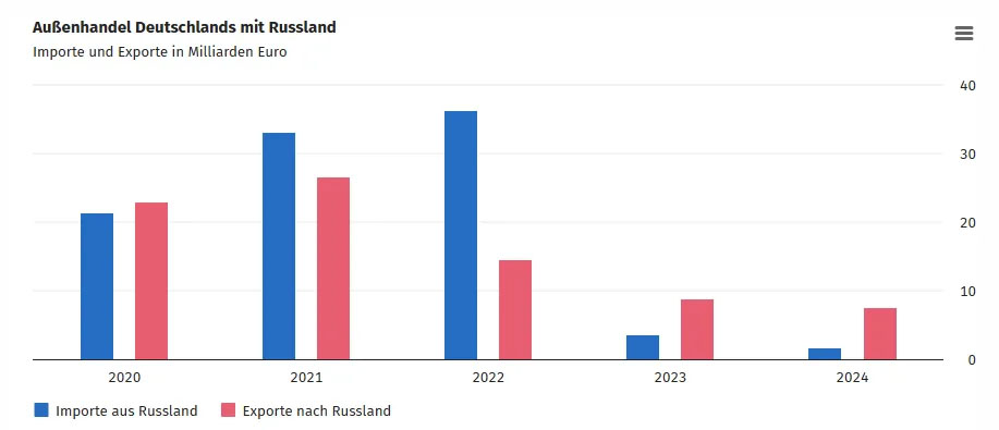 У 2024 році Німеччина купила у РФ товарів на 1,8 млрд євро проти 33,1 млрд євро у 2021 році. Експорт німецьких товарів до Росії з 2021 року впав на 71,6% - до 7,6 млрд євро.