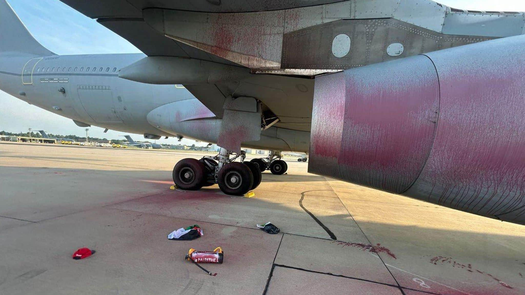 У своїй заяві пропалестинська група написала, що активісти "застосували перероблені вогнегасники, щоб розпилити червону фарбу в турбінні двигуни двох літаків Airbus Voyager, а також завдали додаткових пошкоджень за допомогою ломів".