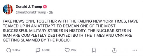 У дописі Трамп різко розкритикував американські ЗМІ, зокрема CNN та The New York Times, за їхні повідомлення про те, що військові удари США по трьох іранських ядерних об'єктах не знищили основних компонентів його ядерної програми.