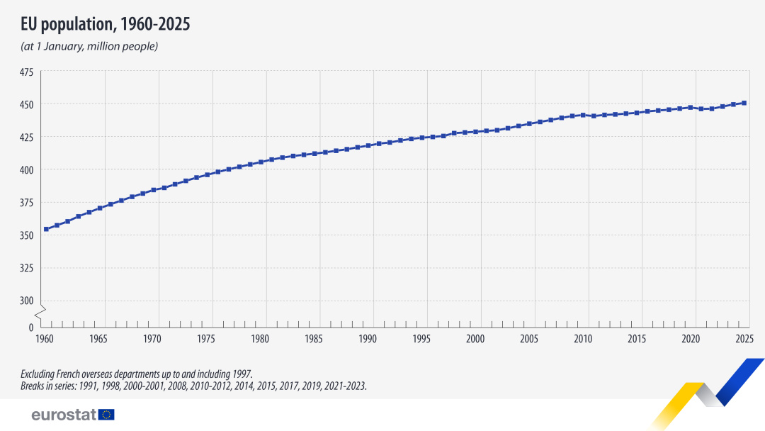 За даними Євростата, якщо розглядати ширші часові рамки, то населення ЄС зросло з 354,5 млн осіб у 1960 році до 450,4 млн осіб на 1 січня 2025 року, тобто на 95,9 млн осіб.