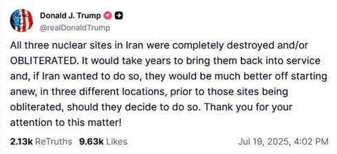 Трамп у суботу, 19 липня, заявив, що всі три ядерні об'єкти в Ірані були "повністю знищені".
