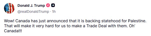 Президент США Дональд Трамп заявив, що готовність Канади визнати Палестину як державу ускладнить канадсько-американські перемовини про нові умови торгівлі.