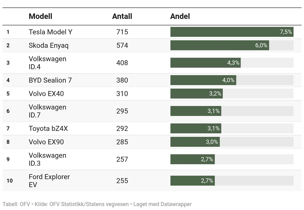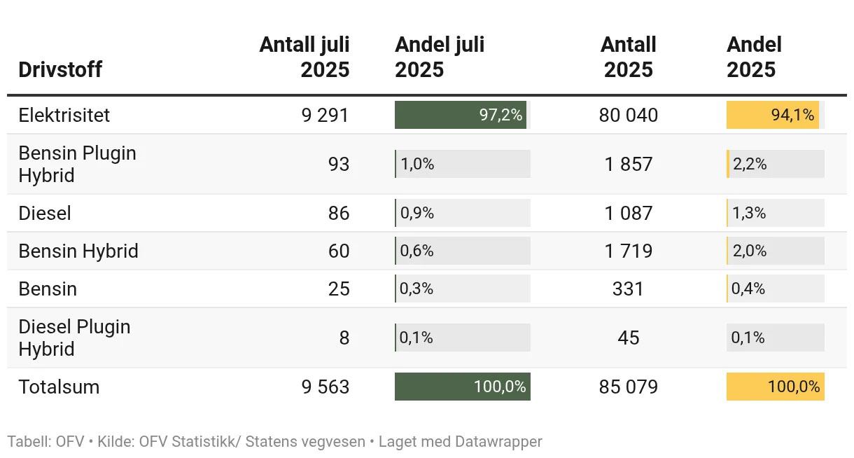 Загалом з початку 2025 року в Норвегії зареєстрували 85 079 нових легкових автомобілів, що на 25,6% більше, ніж за аналогічний період попереднього року. Частка електромобілів зростає і станом на початок серпня становила 94% від усіх нових легкових автомобілів, порівняно з трохи більше ніж 85% за той самий період минулого року.