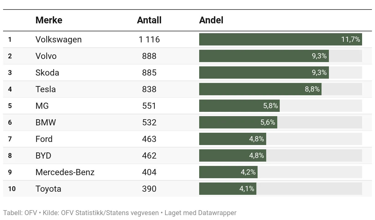 Китайські автомобільні марки та моделі також посилюють свої позиції в Норвегії, маючи ринкову частку трохи більше ніж 13%.