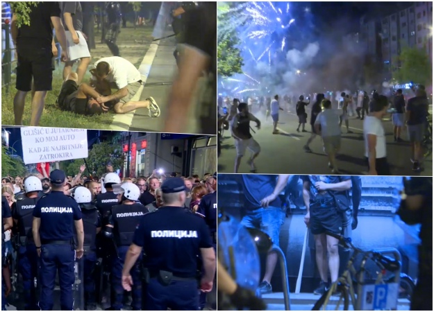 Кадри приватного телеканалу N1 показали, як з боку офісів SNS у протестувальників у Новому Саді кидали фаєри і петарди.