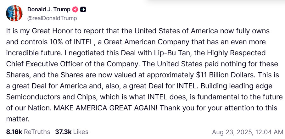 "Для мене велика честь повідомити, що Сполучені Штати Америки тепер повністю володіють та контролюють 10% акцій Intel, великої американської компанії, яка має ще неймовірніше майбутнє. Я уклав цю угоду з Ліп-Бу Таном, шанованим головним виконавчим директором компанії. Сполучені Штати нічого не заплатили за ці акції, і зараз їхня вартість становить приблизно $11 млрд. Це чудова угода для Америки, а також чудова угода для Intel. Створення передових напівпровідників та чипів, чим займається Intel, є основоположним для майбутнього нашої країни. Зробіть Америку знову великою! Дякую за вашу увагу до цього питання", - пише Дональд Трамп у своїй соціальній мережі Truth ("Правда"), недоступній в Україні.