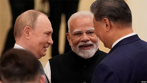 На фото, зробленому, ймовірно, під час нещодавнього саміту Шанхайської організації співпраці в Китаї, китайський лідер Сі Цзіньпін виходить із дверей з президентом Росії Володимиром Путіним, за ними йде прем'єр-міністр Індії Нарендра Моді.