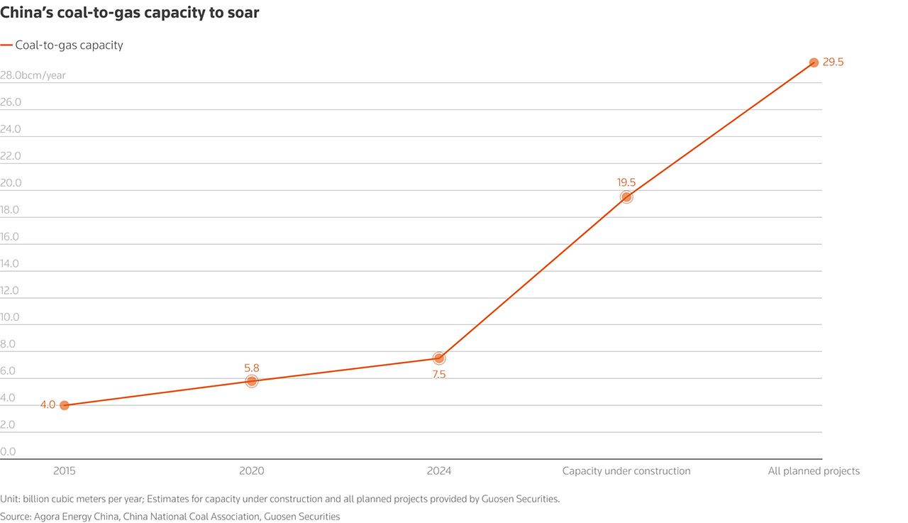 Більшість нових переробних підприємств зводять у вугільних регіонах на північному заході країни, де вже будується декілька заводів загальною потужністю близько 12 млрд куб. м на рік і ще 10 млрд куб. м заплановано. За оцінками Oilchem, газ із вугілля нині майже на третину дешевший за імпортний СПГ - менше ніж 2 юаня за кублметр проти 2,87 юаня без урахування регазифікації та транспорту, хоча трубопровідний газ залишається дешевшим.