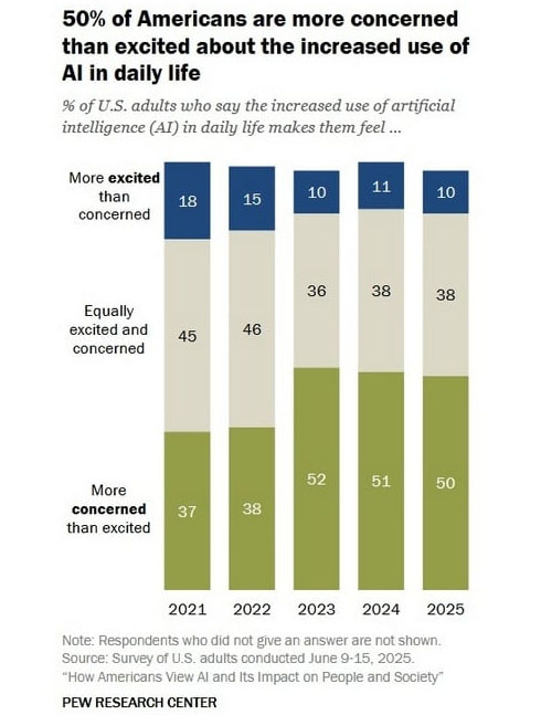 За даними дослідницького центру, жителі США дедалі більше сприймають штучний інтелект як загрозу для повсякденного життя та базових людських якостей - половина респондентів заявила, що поширення штучного інтелекту викликає у них занепокоєння, і лише 10% відчувають наснагу.