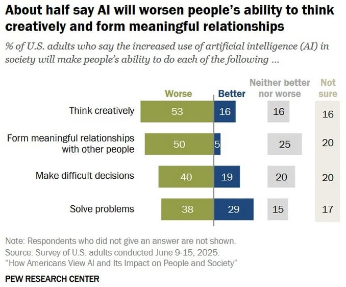 Зазначається, що головний страх американців пов'язаний з втратою ключових навичок - більше 53% опитаних вважають, що ШІ погіршить творче мислення, а половина переконана, що він негативно вплине на міжособистісні стосунки.
