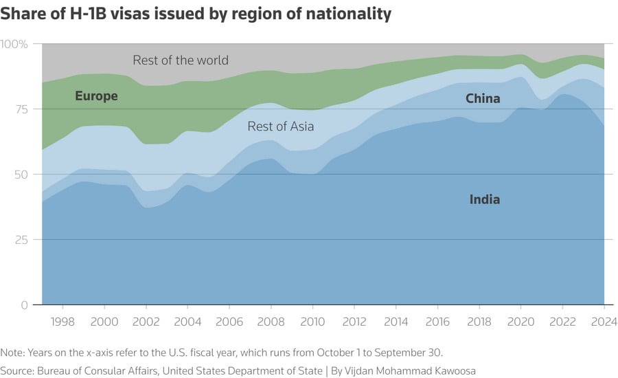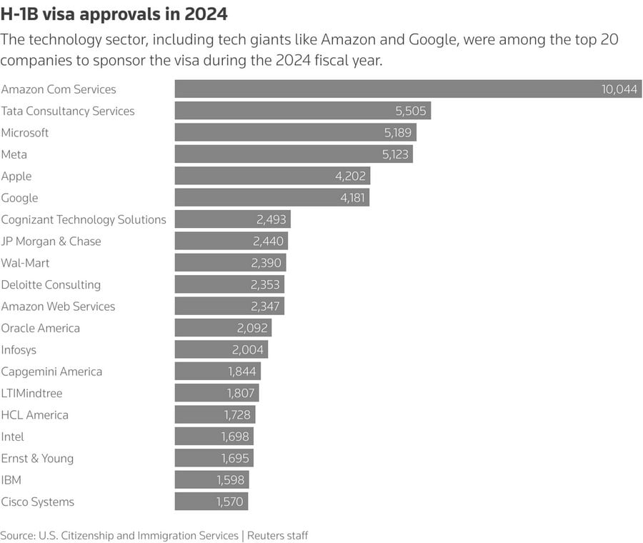 За даними дослідницького центру Pew Research, у 2024 році було схвалено близько 141 000 нових заяв на отримання візи H-1B, а більшість нових схвалень припало на вакансії, пов'язані з комп'ютерними технологіями.