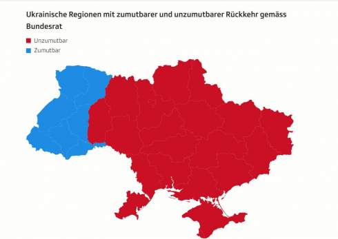 Оскільки в Україні "стійка стабілізація... у середньостроковій перспективі не видається реалістичною", швейцарський уряд і надалі надаватиме українцям статус захисту. Проте, парламент Швейцарії вимагав розрізняти регіони України, повернення до яких вважається прийнятним, і тими, куди повернення є неприйнятним.