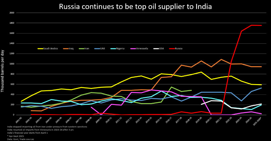 З квітня по вересень 2025 року Індія імпортувала 1,75 мільйона барелів російської нафти на добу, що становить близько 36% усіх поставок, тоді як роком раніше цей показник був 40%.