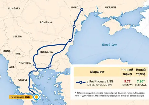 Спільний продукт Route 1 дозволяє бронювати потужності для імпорту природного газу з грецького терміналу LNG Revithoussa до України за спеціальними зниженими тарифами. Маршрут запрацював у липні 2025 року. В останні місяці попит на потужності Route 1 був мінімальним: на січень потужності не бронювали, на лютий - 4,5 тис. куб м на добу.