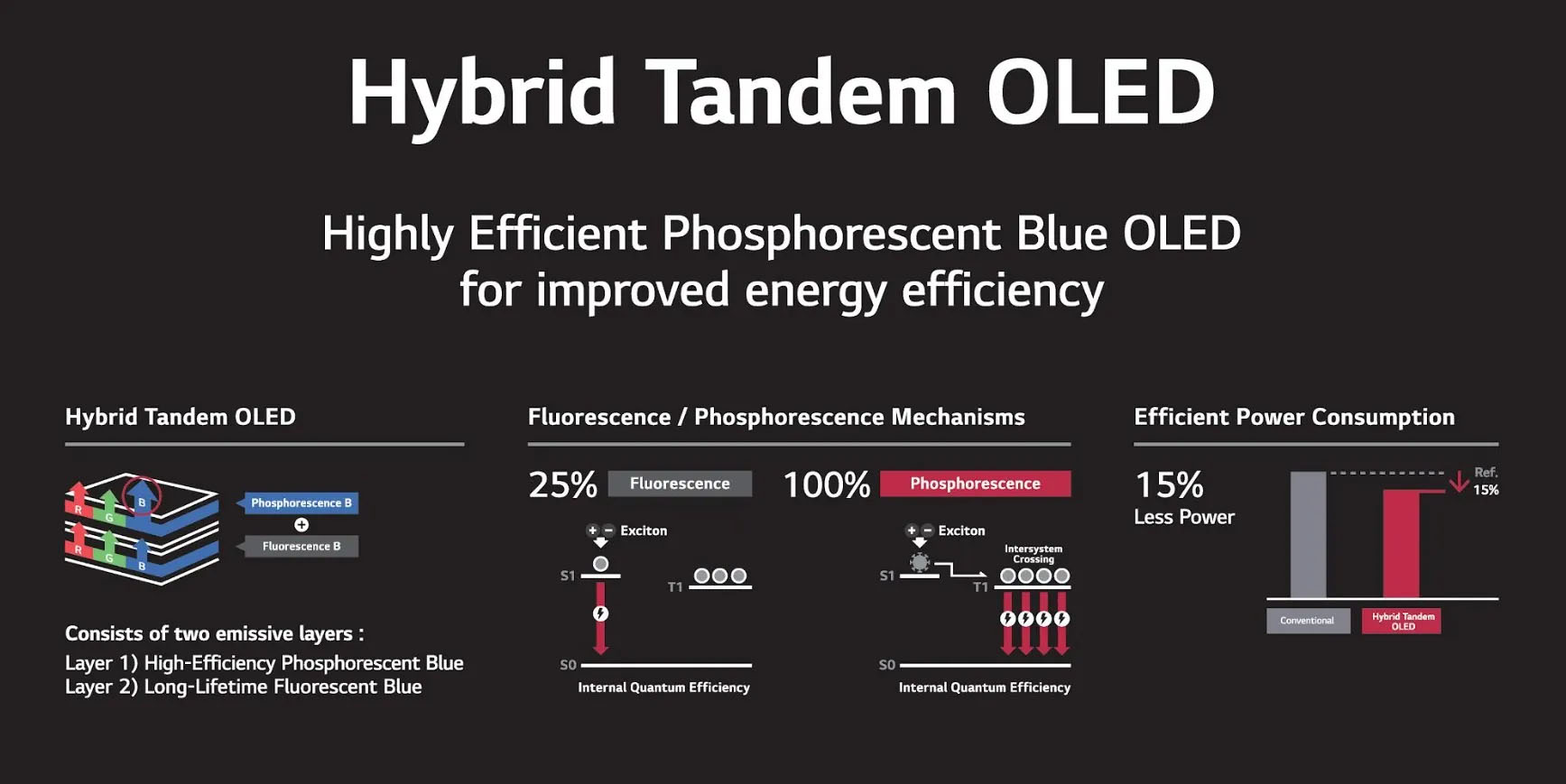 OLED‑дисплеї формують зображення завдяки червоним, зеленим і синім органічним світлодіодам. Синій світлодіод традиційно споживає більше енергії та швидше деградує, ніж червоний і зелений, що обмежувало строки служби екрана й вимагало компромісу між яскравістю й довговічністю. Гібридна технологія LG Display дозволяє поєднати переваги обох підходів: стабільність звичайних панелей із додатковою економією енергії завдяки фосфоресцентному шару.