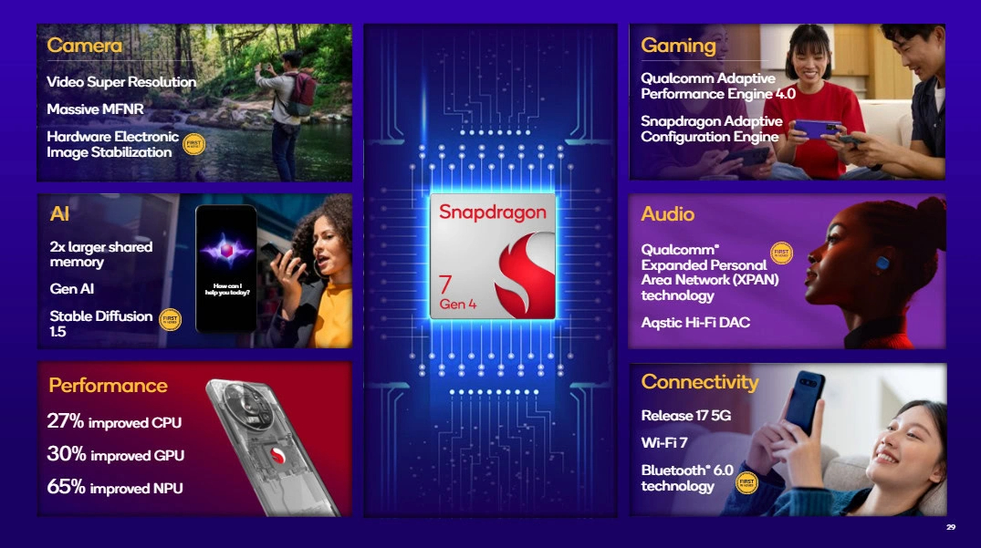 Snapdragon 7 Gen 4 оснащений вбудованим 5G-модемом, підтримує Wi-Fi 7 та Bluetooth 6. Камери можуть мати роздільну здатність до 200 МП, а запис відео можливий у розширенні до 4K при 30 кадрах на секунду.