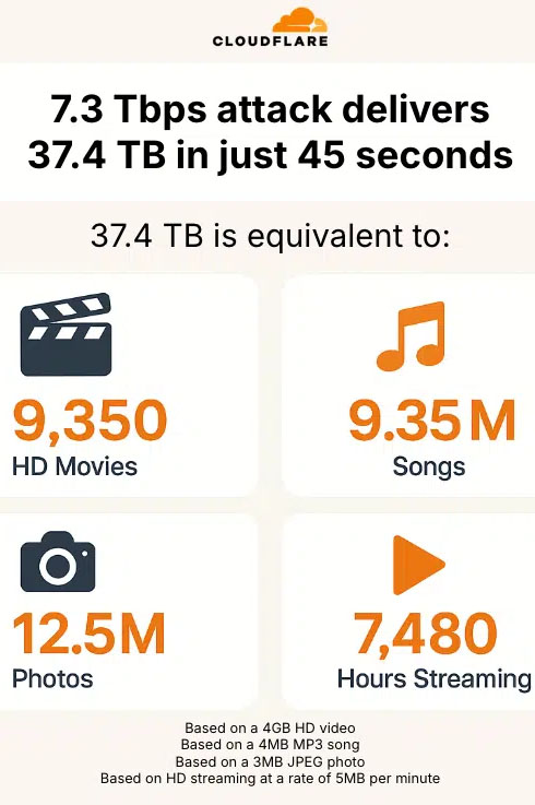 Зловмисники використовували кілька векторів атаки, в основному через протокол UDP, швидший за звичайний TCP, який використовує більшість інтернет-трафіку. UDP є кращим, коли йдеться про реагування програм в режимі реального часу, як потокове відео чи онлайн-ігри. Він не очікує, доки два пристрої в інтернеті узгодять свої дії, надсилаючи дані без підтвердження прийняття. Через це атаки UDP flood є одним із найпоширеніших інструментів DDoS. Інфографіка з The Cloudflare Blog розповідає, що цей обсяг приблизно дорівнює 9350 HD-фільмам, понад 9 млн пісень або 12,5 млн фотографій - переданих лише за 45 секунд.