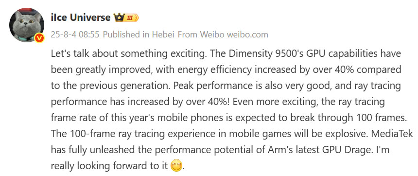 MediaTek працює над новим флагманським процесором Dimensity 9500 - чипом, виготовленим на базі TSMC N3P (3‑нм процесу). За новими витоками, компанія суттєво переробила відеоядро, що дозволило отримати до 40% приросту в іграх. GPU Mali-G1 Ultra MC12 отримає оновлену підтримку трасування променів при менших енергозатратах. Нова архітектура графіки отримала назву Immortalis-Drage і працює на частоті до 1 ГГц.
