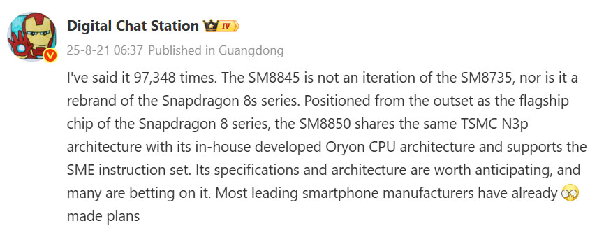 Qualcomm готує Snapdragon 8 Gen 5 (SM8845), який має стати справжнім флагманом для більш спрощених флагманів. Відомий інсайдер Digital Chat Station повідомляє, що чіп отримає ті ж кастомні ядра Oryon і буде виготовлений за 3-нм техпроцесом N3P, як і Snapdragon 8 Elite Gen 2.