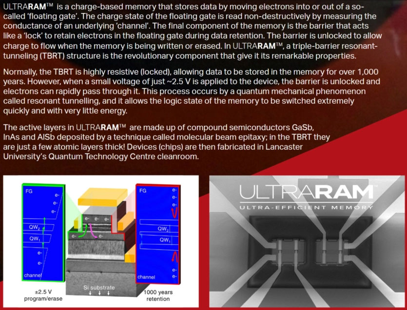 Пам'ять UltraRAM широко відома з 2022 року. Вона стане першою пам'яттю, яка використовуватиме квантово-механічний процес, який називається резонансним тунелюванням. У вересні 2023 року Tom's Hardware відвідав лабораторії UltraRAM, які відокремилися від Ланкастерського університету під керівництвом Quinas Technology. Журналісти побачили прототип мікросхеми UltraRAM у процесі тестування