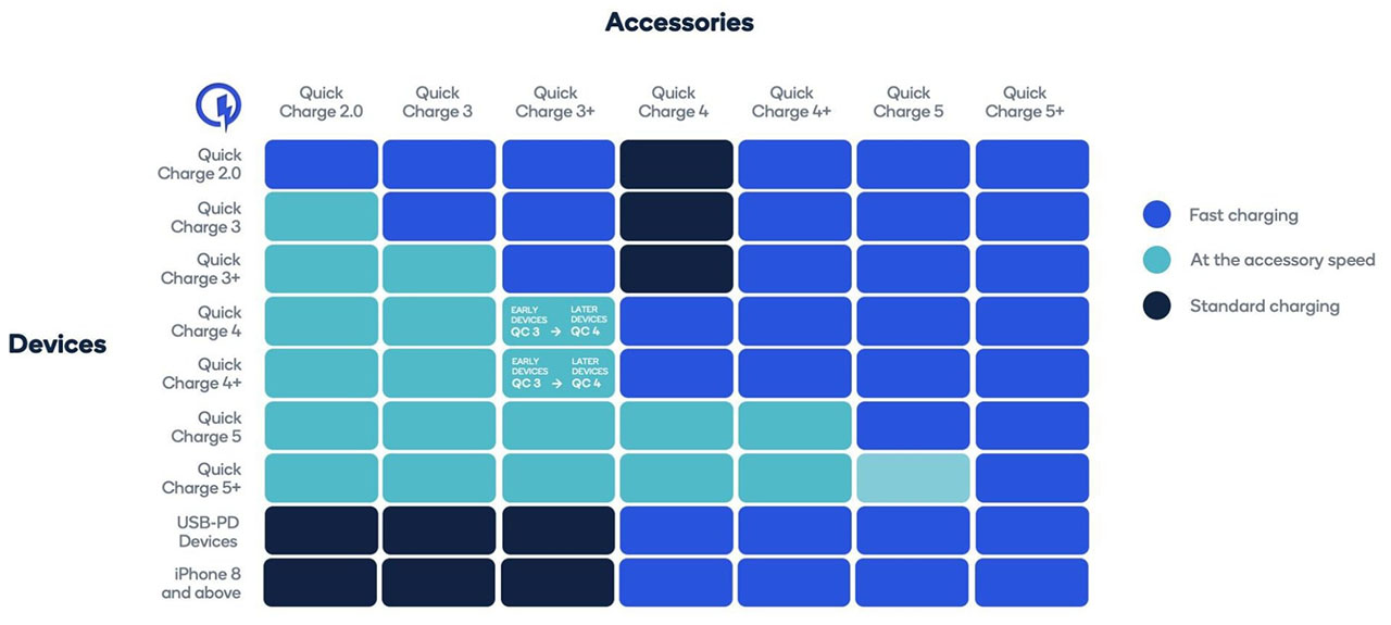 На додачу до всього, Quick Charge 5 Plus працюватиме як на майбутніх пристроях, так і буде сумісною з попередніми версіями Quick Charge 2.0, 3.0, 3.0+, 4.0, 4.0+, 5.