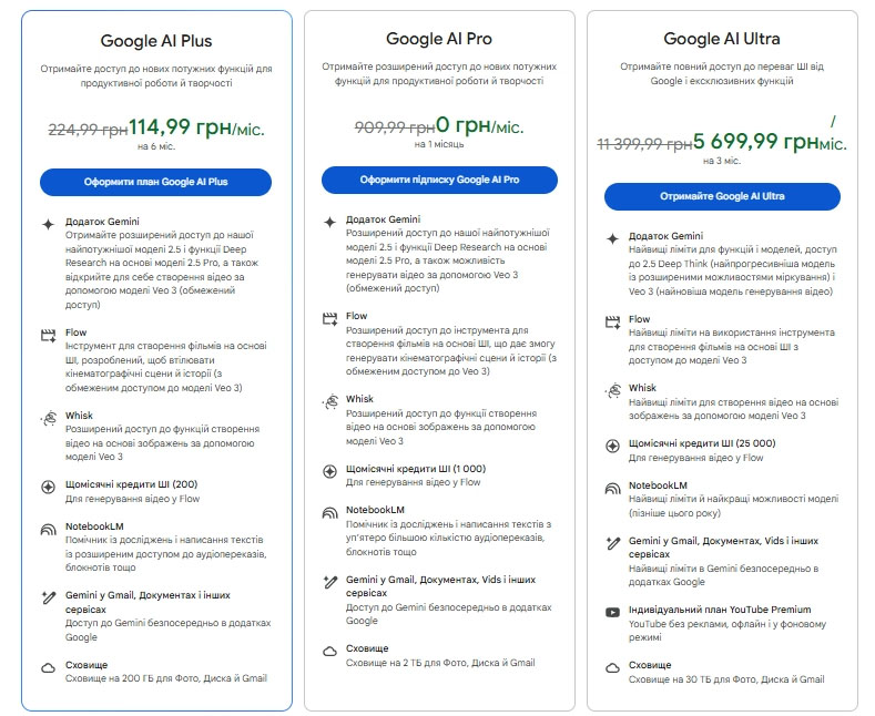 В Україні вартість Google AI Plus стартує від 114,99 грн на місяць протягом перших пів року використання, далі - 224,99 грн. Серед доступних і дорожчих альтернатив: Google AI Pro за 0 грн за перший місяць використання і 909, 99 грн далі; а також Google AI Ultra за 5 699,99 грн/міс. у перші три місяці використання і шалені 11 399,99 грн далі (тут найвищі ліміти і преміумфункції).
