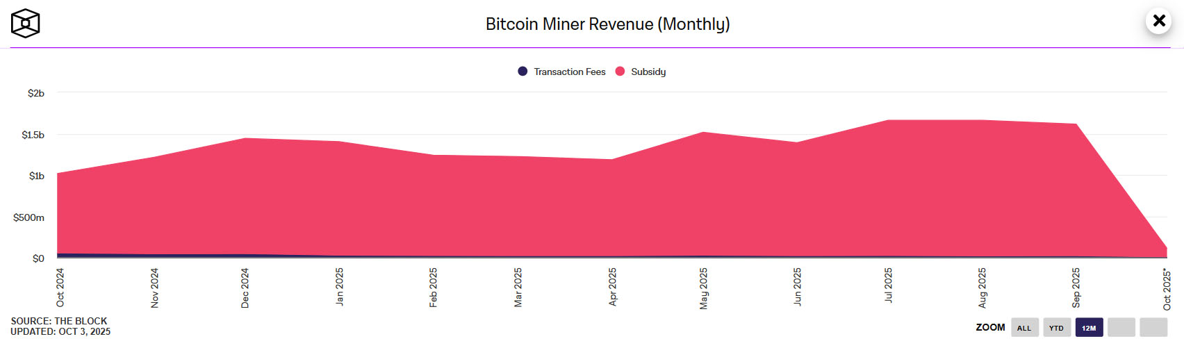 Показник продовжує зростати з початку липня 2025 року. І це видно на графіку місячного доходу майнерів. У липні та серпні обсяг надходжень був однаковим, але у вересні знизився на близько $20 млн: