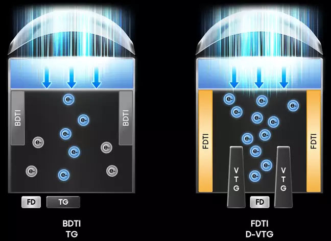 * Технології Front Deep Trench Isolation (FDTI) і Dual Vertical Transfer Gate (D-VTG) для збільшення кількості захоплених фотонів
