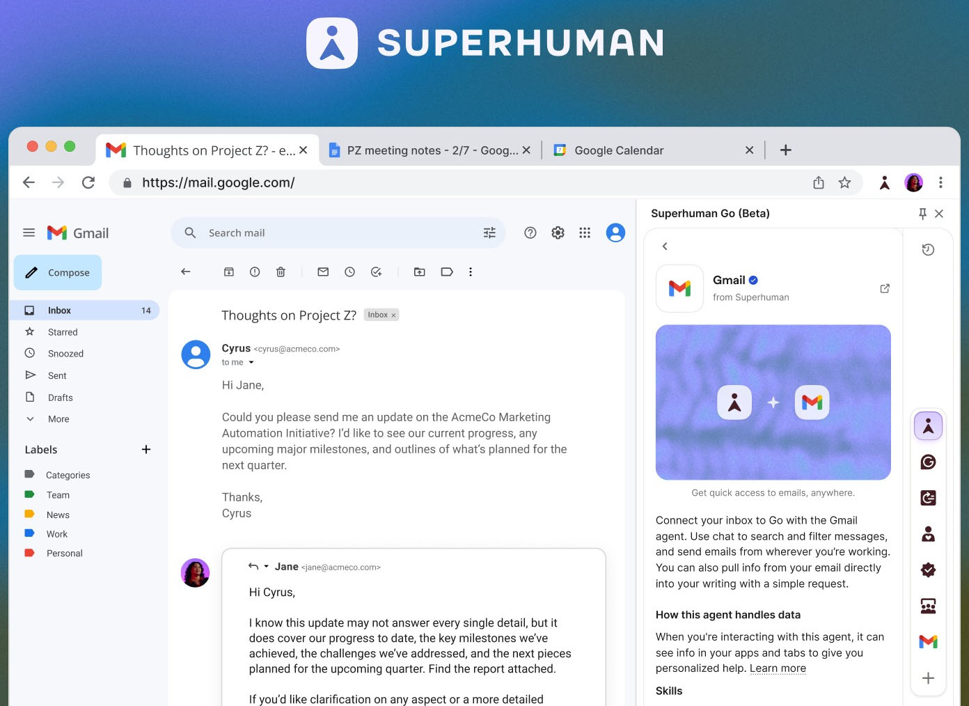 Асистент підключається до понад 100 інструментів і надає потрібну інформацію саме в момент, коли вона необхідна. Superhuman Go може допомогти знайти додаткові дані під час листування, нагадати про попередні обговорення на зустрічах, опрацювати запити користувачів і координувати командні наради.