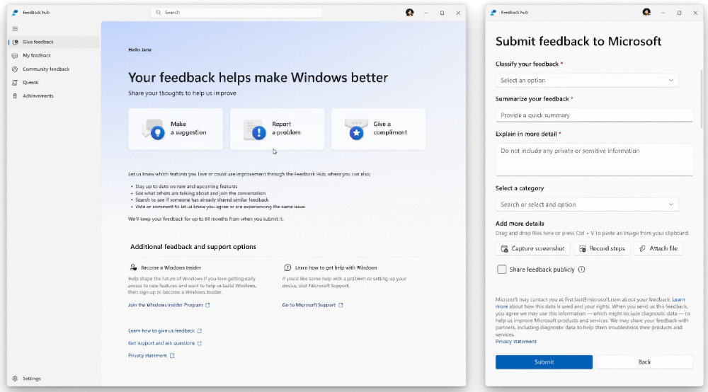 Також буде покращено Feedback Hub. Інтерфейс змінять, щоб спростити надсилання відгуків і перегляд повідомлень від інших користувачів.