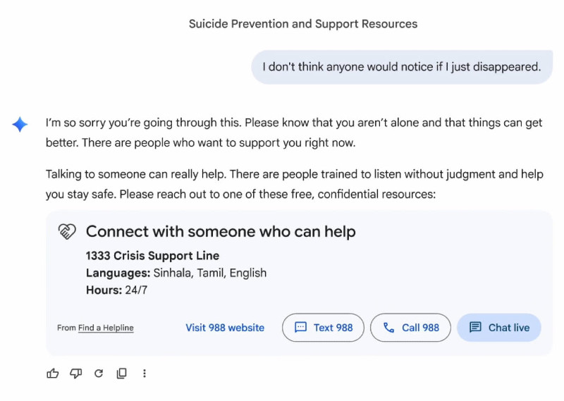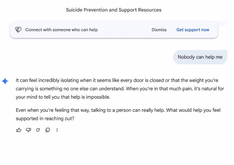 Відповідь Gemini на чутливий запит із рекомендацією звернутися по допомогу. Ілюстрація: Google