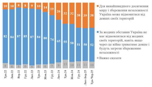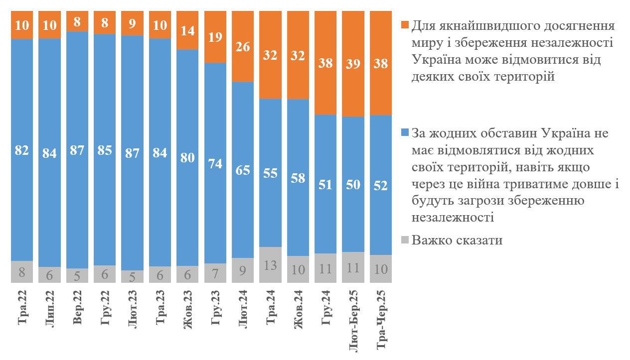 "Порівняно з лютим 2025 року ситуація не змінилася. Так, 52% українців категорично проти жодних територіальних поступок (у лютому 2025 року - 50%). Готові прийняти певні територіальні втрати - 38% (у лютому 2025 року - 39%)", - йдеться у прессрелізі за підсумками соцопитування на сайті КМІС.
