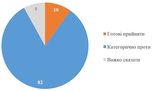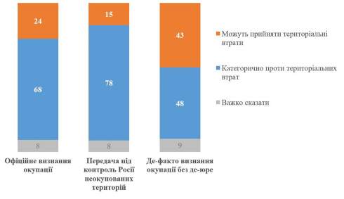 "Якщо мова йде офіційне визнання окремих територій частиною Росії, то переважна більшість (68%) будуть проти. Готові прийняти - 24% (зазначимо, що ми говорити про "окремі території", а не всі окуповані території; залежно від територій може бути істотна диференціація). Також абсолютна більшість - 78% - відкидають передачу під контроль Росії територій, які контролюються Україною. Готові прийняти - лише 15%. Єдиний варіант, де принаймні є простір для дискусій - де-факто визнання контролю Росії без визнання де-юре. Навіть у цьому випадку 43% готові прийняти, а категорично проти - 48%", - йдеться у дослідженні.