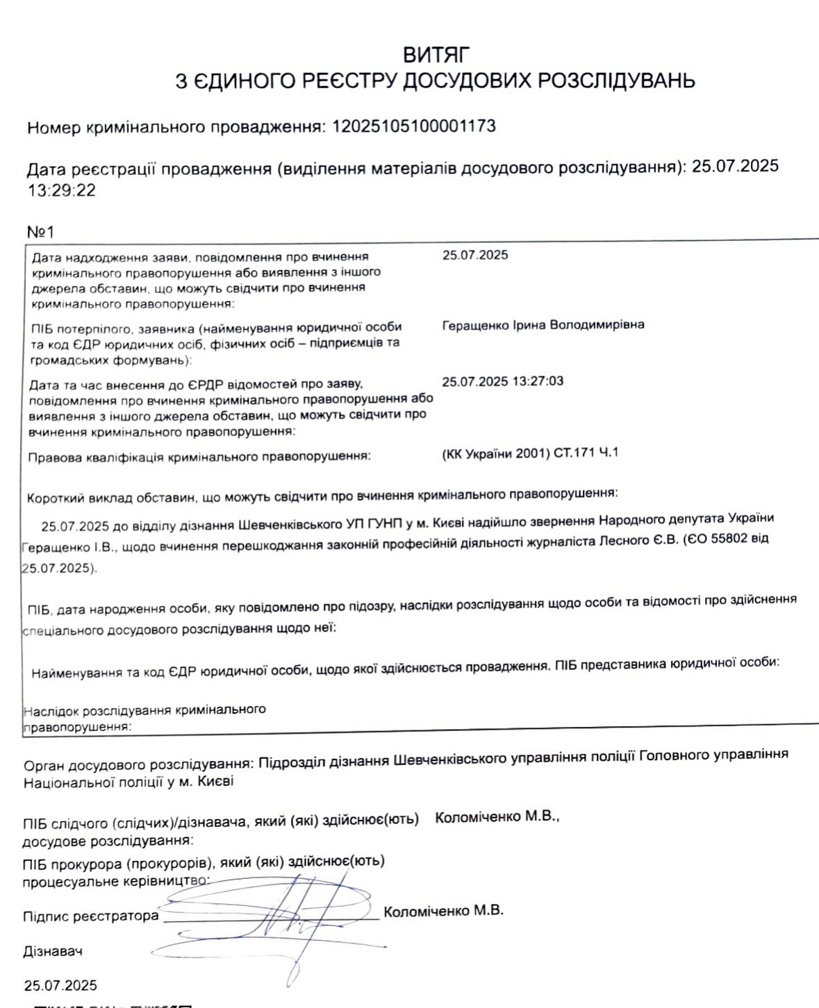 Також парламентарка опублікувала скан-копію витягу з ЄРДР про відкриття провадження №12025105100001173, де вона заявлена як потерпіла, в якому зазначається: "25.07.2025 до відділу дізнання Шевченківського УП ГУНП у м.Києві надійшло зверенння народного депутата Геращенко І.В. щодо вчинення перешкоджання законній професійній діяльності журналіста Лесного Є.В.".
