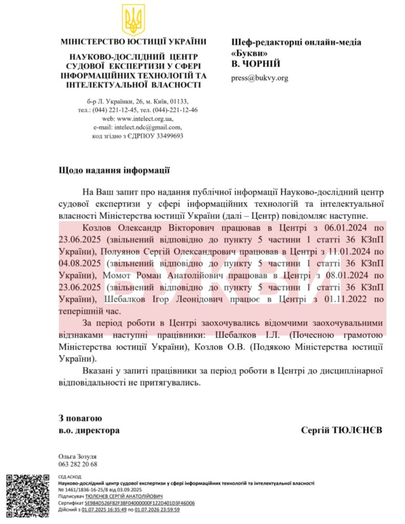 Згідно з наданою інформацією, Олександр Козлов, Сергій Полуянов та Роман Момот, які працювали в Центрі з січня 2024 року, були звільнені влітку 2025 року. Козлов і Момот припинили співпрацю 23 червня 2025 року, а Полуянов - 4 серпня 2025 року. Усі троє були звільнені відповідно до пункту 5 частини 1 статті 36 Кодексу законів про працю України, що передбачає припинення трудового договору за угодою сторін. Четвертий експерт, Ігор Шебалков, який працює в Центрі з 1 листопада 2022 року, залишається на посаді.