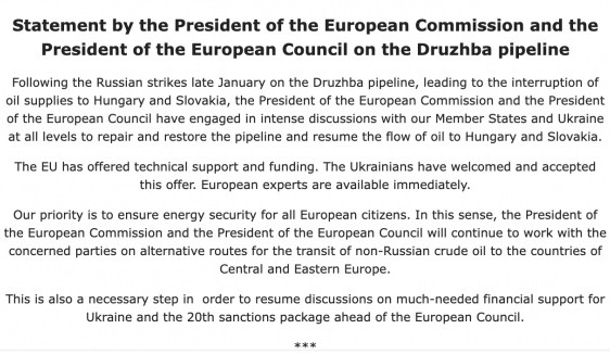 Текст заяви ЄС щодо нафтопроводу "Дружба" відредагували: зникло речення про зв'язок поновлення постачання російської нафти в Європу з наданням Україні кредиту ЄС на 90 млрд євро та 20-м пакетом санкцій проти Росії.