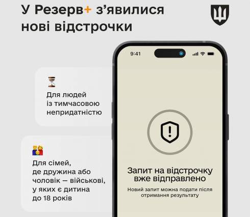 "Відстрочки у Резерв+ уже доступні онлайн для: громадян із тимчасовою непридатністю за результатами ВЛК; сімей, де дружина або чоловік - військові, які мають дитину до 18 років", - написала Черногоренко в Facebook.