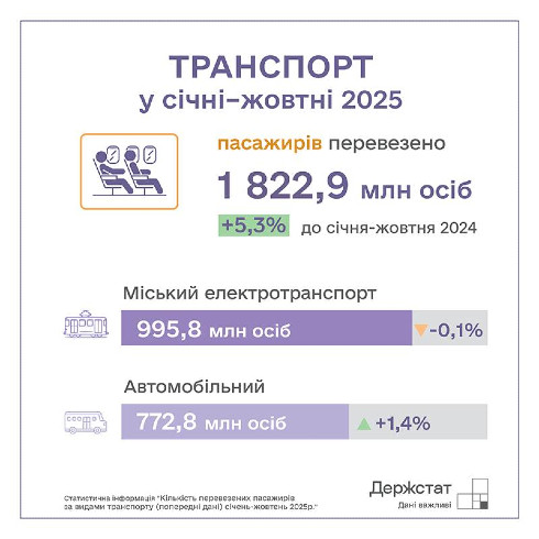 Натомість пасажирські перевезення у січні - жовтні демонструють позитивну динаміку. Загалом за цей період пасажирським транспортом скористалося 1 822,9 млн осіб, що на 0,4% більше відносно січня - жовтня 2024 року.