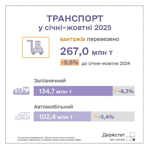 Згідно з даними Держстату, у січні - жовтні 2025 року обсяг внутрішніх вантажних перевезень в Україні скоротився на 9,6% порівняно з минулим роком - до 267 млн т.