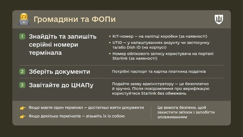 Міністерство оборони опублікувало алгоритм, як верифікувати термінал супутникового зв'язку Starlink в Україні для військових та цивільних.