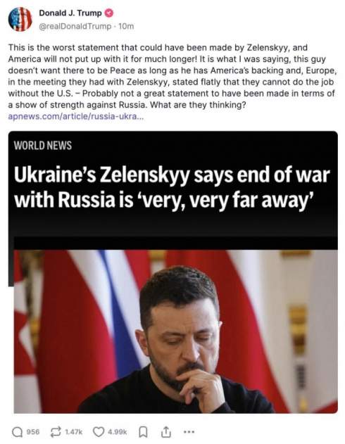 Трамп назвав "найгіршою заявою, яка могла бути зроблена (президентом України Володимиром) Зеленським", заяву українського лідера після зустрічі з європейськими лідерами у Лондоні 2 березня про те, що до кінця війни дуже - дуже далеко.