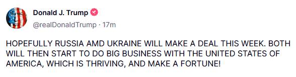 "Сподіваюся, що Росія та Україна укладуть угоду цього тижня. Обидві країни почнуть вести великий бізнес зі Сполученими Штатами Америки, які процвітають, і зароблятимуть статки", - зазначив американський президент.