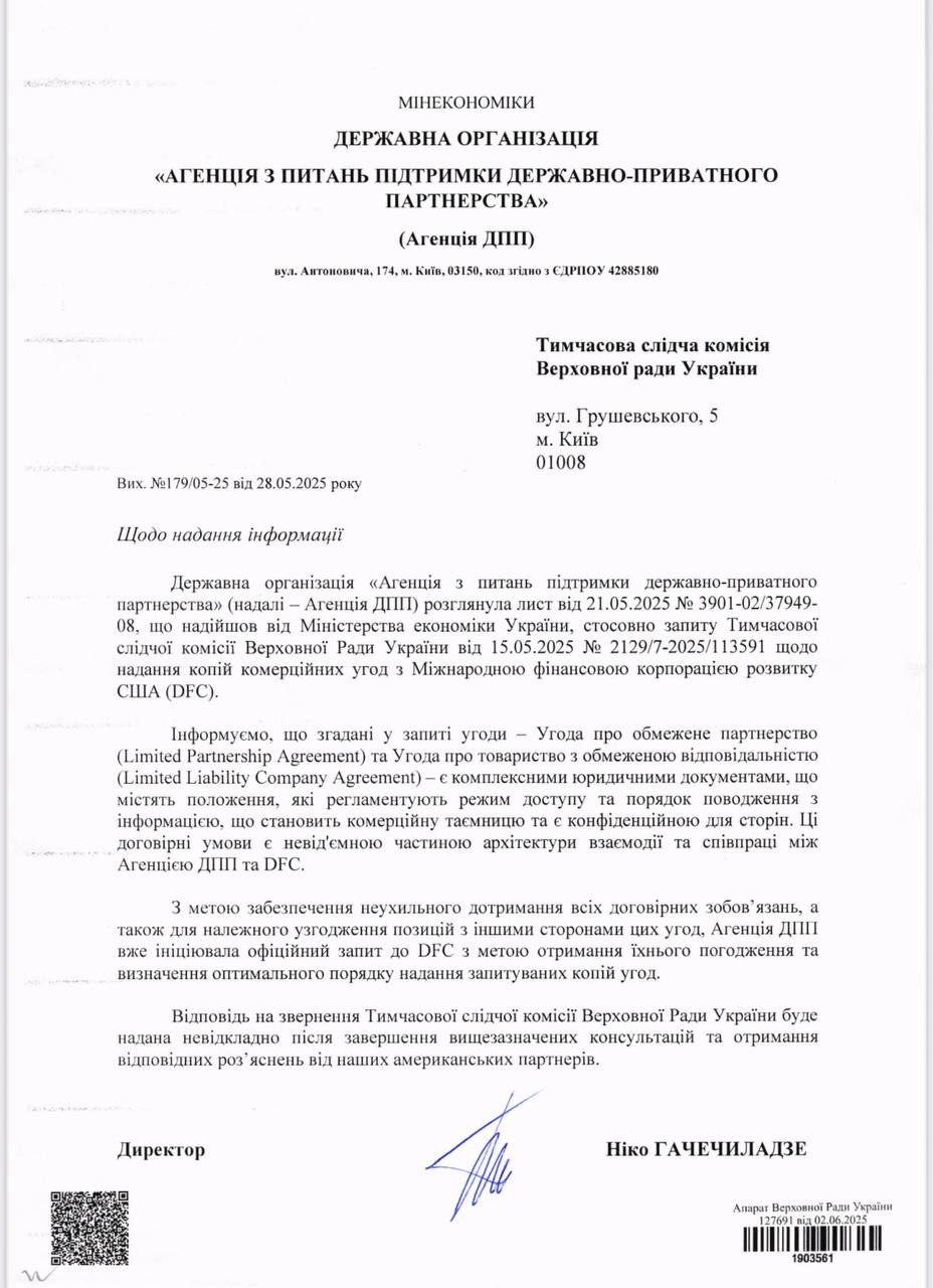 "Інформуємо, що згадані в запиті угоди - Угода про обмежене партнерство (Limited Partnership Agreement) та Угода про товариство з обмеженою відповідальністю (Limited Liability Company Agreement) - є комплексними юридичними документами, що містять положення, які регламентують режим доступу та порядок поводження з інформацією, що становить комерційну таємницю та є конфіденційною для сторін", - йдеться у документі.